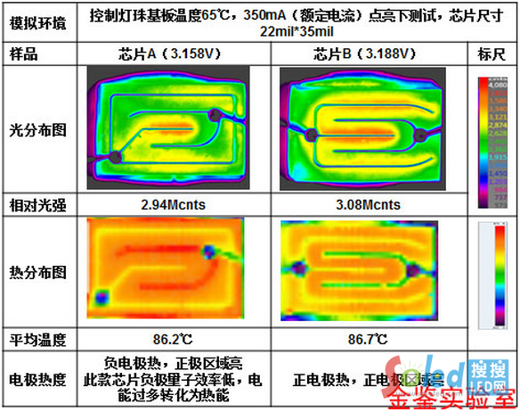 1. 芯片A發(fā)光最強(qiáng),發(fā)熱量最小,光熱分布最均勻,說明該芯片電流密度均勻性好,量子效率高,應(yīng)用在高端LED中,該款芯片是首選。