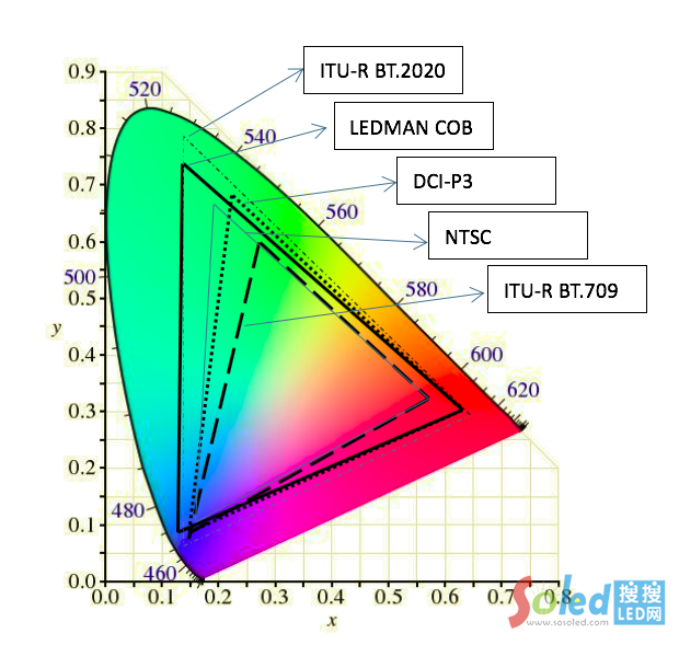 從上圖可以看到,LEDMAN COB的色域三角形,與ITU-R BT.2020的色域標準相比,主要是LED綠光芯片的波長范圍有些差異,但可以通過與芯片廠家協同開發(fā),調整紅、綠、藍三種LED芯片的波長范圍及其它參數,就可以做到盡量覆蓋ITU-R BT.2020的色域范圍,相對來說是比較容易實現。因此基于COB技術的Micro LED微顯示可以實現接近或達到ITU-R BT.2020的色域范圍,色域越大,能夠表現的顏色更豐富,更能還原自然界千姿百態(tài)的顏色。
