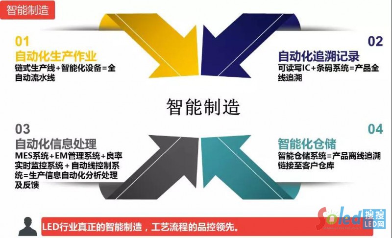 在生產(chǎn)方面,兆馳節(jié)能近兩年在智能制造方面作了大量布局,鏈?zhǔn)缴a(chǎn)線配備高度智能化設(shè)備形成了全自動(dòng)的流水線,MES、ERP系統(tǒng)達(dá)成生產(chǎn)信息自動(dòng)化分析處理及反饋效果,通過(guò)可讀寫(xiě)IC和條碼系統(tǒng)可實(shí)現(xiàn)產(chǎn)品從來(lái)料到出庫(kù)售后的全線追蹤,淘汰傳統(tǒng)的生產(chǎn)信息人工管理方式,滿足生產(chǎn)管理的四個(gè)關(guān)鍵領(lǐng)域的需求:質(zhì)量控制、信息集成、操作優(yōu)化和資源管理。智能化設(shè)備投入生產(chǎn)線后,作業(yè)員工可減少三分之一,產(chǎn)品品控和制造成本將達(dá)到極致。