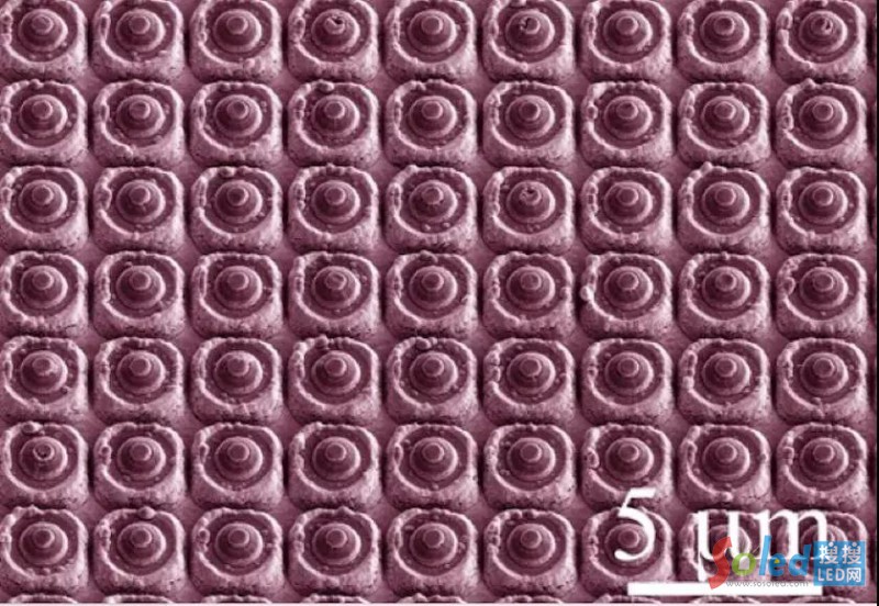 將晶片切割成芯片之前,在單片晶片級刻度上的發(fā)射器上制造諸如微透鏡和反射器陣列的光學元件。為了實現(xiàn)所需的光準直,發(fā)射器臺面直徑被設計為像素間距的三分之一左右。因此,對于2.5μm像素間距,發(fā)射器臺面直徑小于1微米,如圖1中的掃描電子顯微鏡圖像所示。