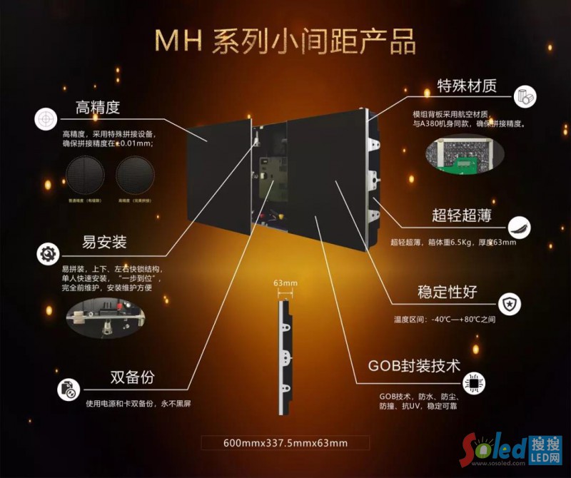 下面跟大家分享一下麗晶光電MH系列小間距產(chǎn)品的亮點(diǎn):如,模組背板采用航空材質(zhì),與A380機(jī)身同款,確保精度與穩(wěn)定性;GOB封裝技術(shù),防水、防塵、防磕碰、抗UV等。
