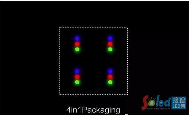 “四合一”即一個封裝結(jié)構(gòu)中有四個基本像素結(jié)構(gòu),其本質(zhì)上依然是四個由12顆RGB--LED芯片合成的“燈珠”。