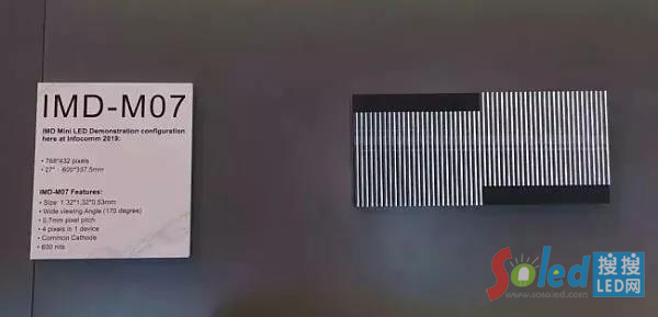 2018年6月8日,國星光電自主研發(fā)的首款Mini LED IMD-M0 9器件在中、美兩地同步首發(fā)。在2019年美國InfoComm 展會上,國星光電展示了P0.7間距的Mini-LED模組。