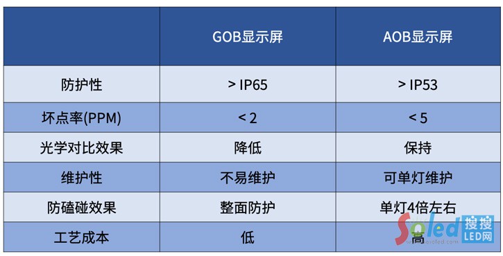 對(duì)于室內(nèi)使用的LED顯示模塊,這樣的解決方案通過(guò)將外露的電性傳導(dǎo)引腳包覆的方式,有效防止因水氣潮濕、灰塵所帶來(lái)的失效故障點(diǎn)等問(wèn)題的發(fā)生,同時(shí)可以提供防護(hù)磕碰的效果,目前市場(chǎng)上的表面覆膜解決方案有GOB顯示屏、AOB顯示屏等等,表1是和一般SMD顯示屏的比較。