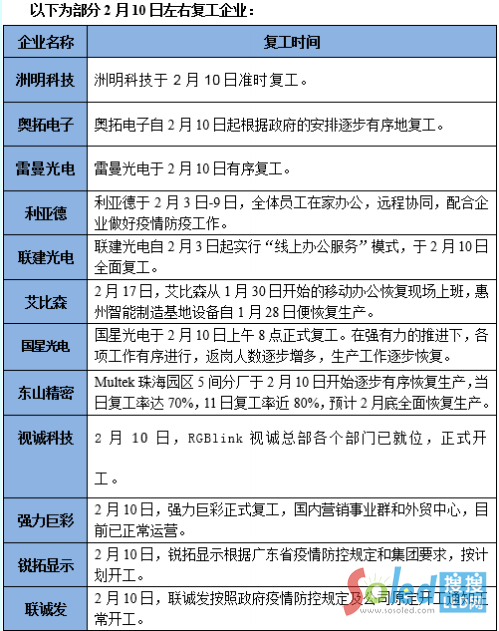 華燦光電是少數(shù)能夠量產(chǎn)紅綠藍(lán)三種發(fā)光芯片的LED廠商,在業(yè)界有著十分重要的地位,其注冊(cè)地正好在湖北武漢,疫情爆發(fā)以來(lái),作為L(zhǎng)ED上游企業(yè), 它的生產(chǎn)運(yùn)營(yíng)關(guān)系著LED顯示供應(yīng)鏈的穩(wěn)定,但據(jù)華燦光電于2月6日發(fā)布的公告顯示,其主要生產(chǎn)運(yùn)營(yíng)在華燦光電(浙江)有限公司、華燦光電(蘇州)有限公司和云南藍(lán)晶科技有限公,目前公司在武漢已無(wú)生產(chǎn),僅保留少部分管理和銷售人員。根據(jù)我們的了解,華燦光電在2月10號(hào)前已經(jīng)開啟了線上辦公模式,截止2月底前華燦光電復(fù)工率已經(jīng)達(dá)到了80%以上,而國(guó)星光電作為國(guó)內(nèi)封裝龍頭,其復(fù)工復(fù)產(chǎn)也關(guān)系到顯示產(chǎn)業(yè)中游環(huán)節(jié)的安全,而據(jù)公開信息顯示,國(guó)星光電RGB事業(yè)部早在2月初已經(jīng)開始線上辦公,并于10日正式復(fù)產(chǎn),預(yù)計(jì)3月中下旬可實(shí)現(xiàn)滿產(chǎn)。