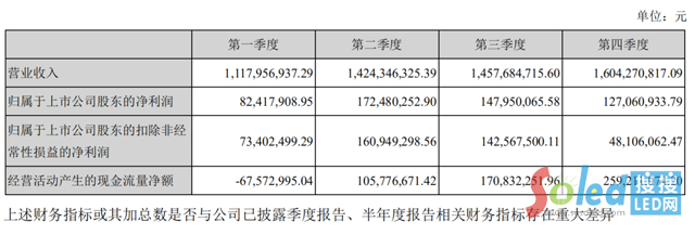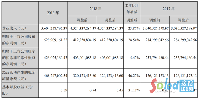 4月25日,洲明科技發(fā)布2019年年度報告,公司實現(xiàn)營業(yè)收入56.04億元,同比增長23.87%;歸母凈利潤達5.30億元,同比增長28.54%;其中經營性活動現(xiàn)金流凈額4.68億元,同比增長46.27%,占凈利潤比例87.05%。