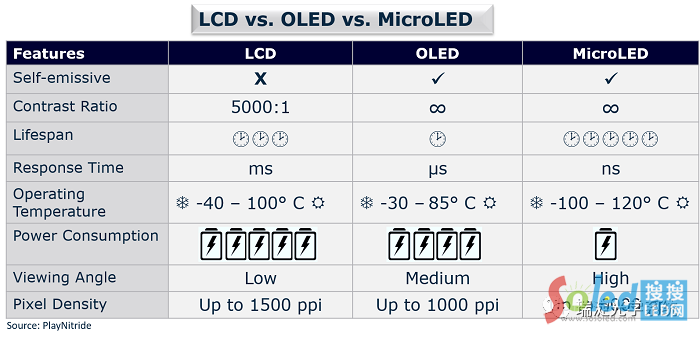 來源:PlayNitride PlayNitride總結(jié)了MicroLED顯示技術(shù)與OLED和LCD相比的差異及優(yōu)點(diǎn)。(原始圖片©PlayNitride1版權(quán)所有)