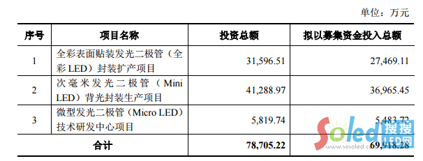 瑞豐光電本次募集資金擬投資于全彩表面貼裝發(fā)光二極管(全彩LED)封裝擴產(chǎn)項目、次毫米發(fā)光二極管(MiniLED)背光封裝生產(chǎn)項目、微型發(fā)光二極管(MicroLED)技術(shù)研發(fā)中心項目。