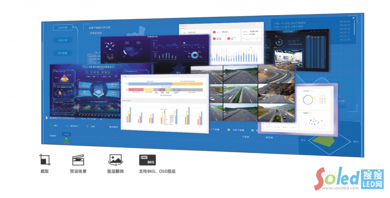 海量圖層任意布局,單卡16個圖層(最高單接口16圖層),支持圖層任意跨接口漫游,圖層規(guī)格不變?蓪崿F(xiàn)任意開窗、疊加、無極縮放,并支持畫面截取、圖層設(shè)置、圖層翻轉(zhuǎn)等功能,創(chuàng)造豐富靈動的視覺效果。