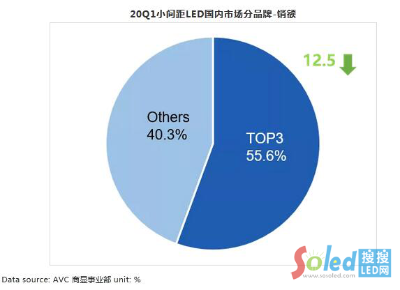 進(jìn)入小間距市場的品牌越來越多,大概分為三大陣營,第 一陣營是傳統(tǒng)的LED顯示屏企業(yè),技術(shù)儲備成熟,研發(fā)能力強,業(yè)務(wù)方向正在從傳統(tǒng)的專業(yè)顯示領(lǐng)域向商用領(lǐng)域、家用領(lǐng)域拓展,第二陣營是傳統(tǒng)的DLP企業(yè),如威創(chuàng)以COB為突破口,第三陣營是傳統(tǒng)的LCD企業(yè),其中安防類的海康、大華發(fā)展迅速,搶占大量市場份額。2020年一季度小間距LED TOP3品牌分別為利亞德、洲明、強力巨彩,市場份額占比55.6%,同比下降12.4個百分點,安防企業(yè)緊隨其后,可以預(yù)見,2020年TOP品牌的競爭格局將會發(fā)生巨大的變化。