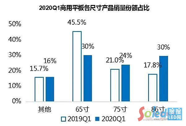 奧維數(shù)據(jù)顯示,商用平板產(chǎn)品,一季度中傳統(tǒng)大頭,65英寸市場(chǎng)占比下降超過(guò)三分之一,歷史上首次將“最高占比細(xì)分尺寸”讓位給86英寸。一季度,86和75英寸等大尺寸產(chǎn)品市場(chǎng)占比接近55%,且需求中心向86英寸轉(zhuǎn)移與升級(jí)的趨勢(shì)“非常明顯”。