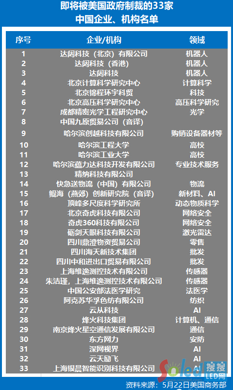 據(jù)路透社報(bào)道,美國(guó)商務(wù)部當(dāng)?shù)貢r(shí)間6月3日表示,將對(duì)5月22日新增列入“實(shí)體清單”的33家中國(guó)企業(yè)、機(jī)構(gòu)以及個(gè)人自6月5日起(本周五)正式實(shí)施制裁。