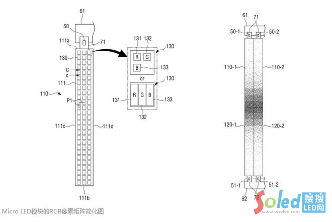 該模塊由數(shù)百個Micro LED像素組成,每個像素又分為紅、綠、藍子像素。子像素在像素中的排布暫時不清楚,可能是排布成三角形,也可能是拉長的子像素相鄰排列。專利中提到了顯示器的分辨率。按照常規(guī)格式16:9,分辨率為3,840 x 2,160,即4K超高清。隨著像素密度的增加,8K (7,680 x 4,320)也是可能實現(xiàn)的。