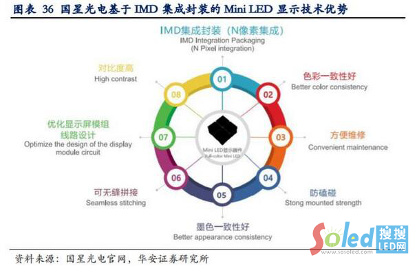 LED 行業(yè)廠商:國(guó)星光電于 2018 年在美國(guó) Infocomm 視聽展上公開展示的首款 MiniLED 顯示產(chǎn)品 IMD-M09 標(biāo)志著 LED 顯示行業(yè)正式步入 P0.X 時(shí)代。并于 2019 年 6 月美國(guó) Infocomm 視聽展上推出可媲美液晶顯示效果的 IMD-M07。
