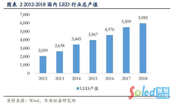 受益于成本優(yōu)勢(shì)、國(guó)家政策支持及旺盛的下游需求,我國(guó)成為 LED 全球產(chǎn)能轉(zhuǎn)移的主要受益者,目前已成為全球最主要的 LED 生產(chǎn)基地。高工 LED 研究所(GGII)數(shù)據(jù)顯示,2012-2018 年國(guó)內(nèi) LED 產(chǎn)值從 2059 億元增長(zhǎng)至 5,985 億元,年復(fù)合增速高達(dá) 16.47%。