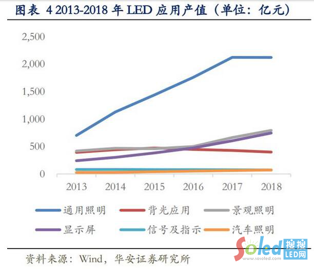 LED 下游應(yīng)用領(lǐng)域主要包括通用照明、景觀照明、顯示屏、背光應(yīng)用、信號(hào)及指示、汽車照明等領(lǐng)域。2018 年 LED 產(chǎn)業(yè)數(shù)據(jù)顯示,占比最 高的通用照明行業(yè)已趨于飽和,而顯示屏及景觀照明應(yīng)用領(lǐng)域產(chǎn)值有良好增長(zhǎng)趨勢(shì)。