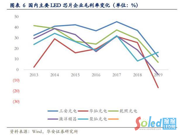 2019 年是行業(yè)比較困難的一年,芯片產(chǎn)能過(guò)剩嚴(yán)重,稼動(dòng)率很低,企業(yè)為了去庫(kù)存紛紛降價(jià)。據(jù)三安光電 2019 年經(jīng)營(yíng)數(shù)據(jù),芯片前三個(gè)季度產(chǎn)品價(jià)格降幅較大,進(jìn)入第四季度產(chǎn)品價(jià)格才逐漸趨于穩(wěn)定。反應(yīng)在各企業(yè) LED 芯片業(yè)務(wù)的毛利率上,呈現(xiàn)快速下行的趨勢(shì)。