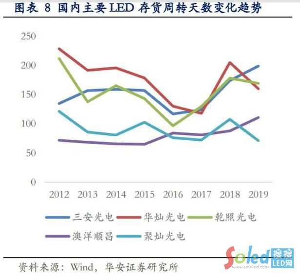 除三安光電存貨數(shù)據(jù)依然高企,其他幾家 LED 芯片廠商的庫(kù)存情況已有下降。我們可以看到,華燦光電、乾照光電、聚燦光電的存貨周轉(zhuǎn)天數(shù)也均有下降,整體看芯片行業(yè)的產(chǎn)能過(guò)剩和存貨問(wèn)題得到一定緩解。