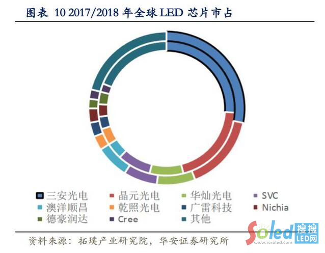 LED 芯片產(chǎn)能過(guò)剩,市場(chǎng)價(jià)格競(jìng)爭(zhēng)激烈,不少芯片廠商營(yíng)收和凈利潤(rùn)雙雙下降,如德豪潤(rùn)達(dá)這類中小廠商被迫退出芯片市場(chǎng)。2018 年,我國(guó)前三家 LED 芯片廠商市占率合計(jì) 71%,其中三安光電達(dá)到 31%,而其在 2018 年全球 LED 芯片市場(chǎng)中市占率達(dá)到 28%。芯片行業(yè)整體競(jìng)爭(zhēng)格局已初步成型,寡頭效應(yīng)愈發(fā)明顯,未來(lái)行業(yè)集中度料將繼續(xù)提升。