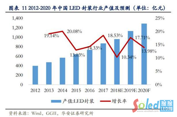 高工產(chǎn)研 LED 研究院(GGII)統(tǒng)計(jì)數(shù)據(jù)顯示,2019 年中國(guó) LED 封裝產(chǎn)值達(dá)到1130 億元,同比增長(zhǎng) 17.71%,2020 年產(chǎn)值預(yù)計(jì)將達(dá) 1288 億元,但增速放緩至 13.98%。