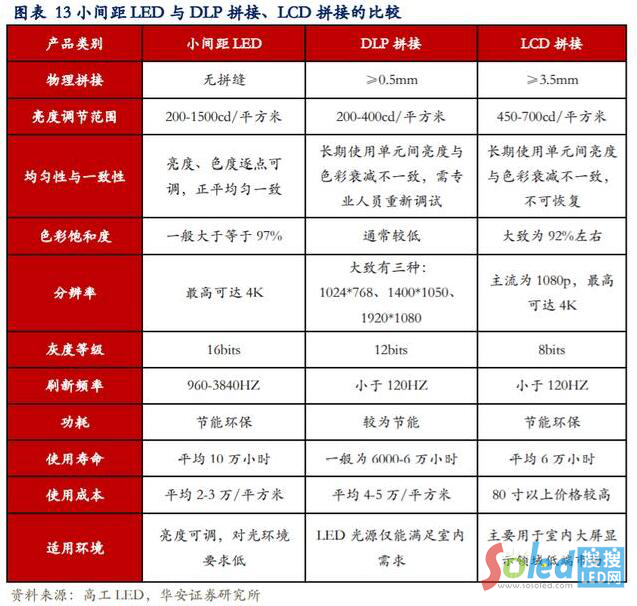 小間距 LED 屏擁有 LCD 拼接屏和 DLP 拼接屏所不具備的無(wú)縫拼接、高亮度范圍可調(diào)、色彩還原度高、顯示均勻性和一致性好、能耗低壽命長(zhǎng)等優(yōu)勢(shì)。近年來(lái),小間距 LED 逐漸從室外走向室內(nèi),形成對(duì) DLP、LCD 拼接屏的替代趨勢(shì)。