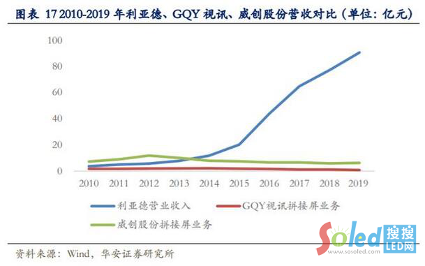 隨著顯示技術(shù)持續(xù)精進(jìn)和生產(chǎn)成本的不斷下降,商用領(lǐng)域的機(jī)場(chǎng)、商業(yè)購(gòu)物中心、學(xué)校教育、商業(yè)企業(yè)、展覽展示等市場(chǎng)已經(jīng)開始采用小間距電視顯示各類信息,各種LED 新技術(shù)的應(yīng)用將加速小間距在商用領(lǐng)域的滲透,形成對(duì)傳統(tǒng)拼接屏的替代趨勢(shì)。體現(xiàn)在傳統(tǒng)拼接屏企業(yè)業(yè)績(jī)上,如威創(chuàng)股份、GQY 視訊呈明顯下滑的趨勢(shì),而小間距全球龍頭利亞德自 2015 年來(lái)營(yíng)收快速增長(zhǎng)。