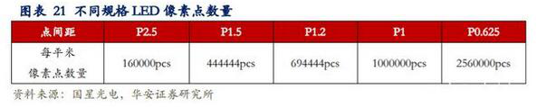 目前多家 LED 顯示企業(yè)均已推出了 P0.9mm 的產(chǎn)品,如利亞德、洲明、艾比森等,更有企業(yè)推出 P0.7mm、P0.6mm 等更小規(guī)格的產(chǎn)品,P0.6/0.7mm 多處于樣品階段,而能實(shí)現(xiàn)量產(chǎn)出貨的產(chǎn)品目前為 P0.9mm,從 P0.9mm 的市場(chǎng)終端價(jià)格看,每平方的價(jià)格高達(dá) 20 萬(wàn),5 平方米以上的應(yīng)用金額即突破百萬(wàn),高昂的成本導(dǎo)致目前市場(chǎng)應(yīng)用定位在高端指揮室、會(huì)議室、高端私人家庭影院等高端市場(chǎng)。