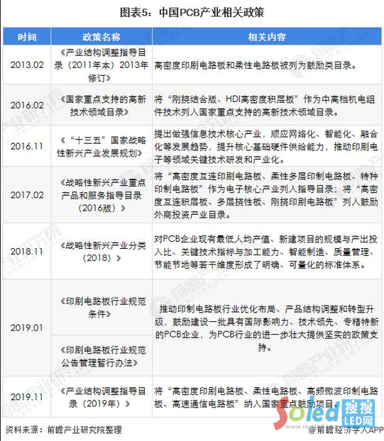 電子信息產(chǎn)業(yè)是我國重點(diǎn)發(fā)展的戰(zhàn)略性、基礎(chǔ)性和先導(dǎo)性支柱產(chǎn)業(yè),而PCB是現(xiàn)代電子設(shè)備中必不可少的基礎(chǔ)組件,在電子信息產(chǎn)業(yè)鏈中起著承上啟下的關(guān)鍵作用。因此我國政府和行業(yè)主管部門推出了一系列產(chǎn)業(yè)政策對PCB行業(yè)進(jìn)行扶持和鼓勵,引導(dǎo)PCB產(chǎn)業(yè)步入健康發(fā)展軌道。2013年,發(fā)改委發(fā)布《產(chǎn)業(yè)結(jié)構(gòu)調(diào)整指導(dǎo)目錄(2011年本)》(2013年修訂本),將高密度印刷電路板和柔性電路板列為鼓勵類目錄;2019年1月,工信部發(fā)布《印制電路板行業(yè)規(guī)范條件》和《印制電路板行業(yè)規(guī)范公告管理暫行辦法》,推動印刷電路板行業(yè)優(yōu)化布局,鼓勵建設(shè)一批具有國際影響力、技術(shù)領(lǐng)先、專精特新的PCB企業(yè)。