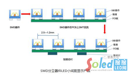 LED小間距顯示技術(shù),從2010年開(kāi)始推出SMD分立器件技術(shù)的產(chǎn)品,使得戶內(nèi)LED顯示屏的點(diǎn)間距,從3mm時(shí)代進(jìn)入了2.5mm的LED小間距顯示時(shí)代。隨著市場(chǎng)需求的推動(dòng),LED小間距顯示屏市場(chǎng),獲得了遠(yuǎn)高于傳統(tǒng)LED顯示屏市場(chǎng)的高速增長(zhǎng),帶動(dòng)了SMD分立器件LED小間距顯示技術(shù)的成熟,點(diǎn)間距也從2.5mm、1.9mm、1.5mm、1.2mm,一路下探到1.0mm附近,這時(shí)SMD分立器件LED小間距顯示技術(shù),碰到了難以逾越的技術(shù)障礙。隨著點(diǎn)間距的逐漸減小,SMD器件防碰撞能力差,SMD分立器件LED小間距顯示技術(shù)的可靠性已經(jīng)不能達(dá)到用戶的要求,同時(shí)難以實(shí)現(xiàn)1mm以下點(diǎn)間距。