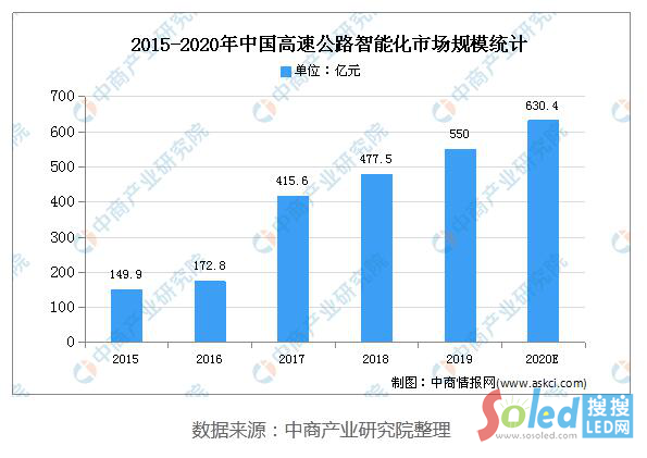 隨著人工智能技術(shù)的逐步成熟以及多項政策的推動下,高速公路智能化、智慧化成為當(dāng)下公路運輸?shù)闹饕l(fā)展方向,通過基礎(chǔ)設(shè)施的建設(shè),公路網(wǎng)絡(luò)建設(shè)將持續(xù)增加,公路貨運能力也將不斷提升。數(shù)據(jù)顯示,2015-2017年中國高速公路智能化市場規(guī)?焖侔l(fā)展,從149.9億元增長至415.6億元,3年間增長了265.7億元,年均復(fù)合增長率達到40%。隨著中國高速公路智能化建設(shè)的進一步發(fā)展,市場規(guī)模將逐漸攀升,中商產(chǎn)業(yè)研究院預(yù)測,2020年我國高速公路智能化市場規(guī)模將突破600億元大關(guān)。