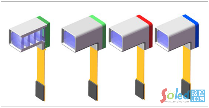 JBD的0.13英寸單色光機(jī),從左到右:切面視圖、綠色、紅色和藍(lán)色光機(jī)