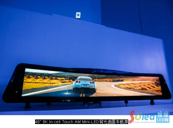 142”IGZO玻璃基主動式MLED顯示屏,它的特點是可以無限拼接,想要多大屏就有多大屏,舞臺布置、會議展示更從容。48”8K In-cell Touch AM Mini-LED背光曲面車載屏,一體化超大屏,智能更便捷,駕駛更有趣,而這也是特斯拉引領(lǐng)的亮點。