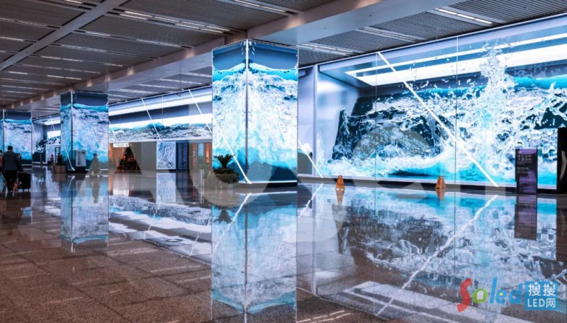 走出機(jī)場(chǎng)航站樓,在樞紐中心迎面而來的U型屏和兩側(cè)的大屏,讓旅客無論是從哪個(gè)角度都能感受到撲面而來的海浪。