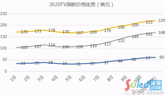 以32吋面板為例,今年6月份前單價還在33美金左右徘徊,三季度每月增長超5美金,9月達到50美金。根據(jù)10月新行業(yè)監(jiān)測數(shù)據(jù),32吋面板單價已達到57美金,11月預計將達到60美金,對比6月初的價格已接近翻番,大漲行情持續(xù)近半年。