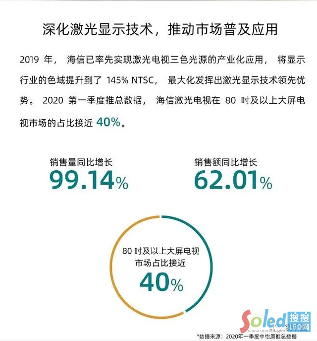中怡康今年第1季度推總數(shù)據(jù)還顯示,海信激光電視銷售量同比增長99.14%,銷售額同比增長62.01%,在80吋及以上大屏電視市場(chǎng)的占比接近40%,繼續(xù)保持著高速增長的勢(shì)頭。