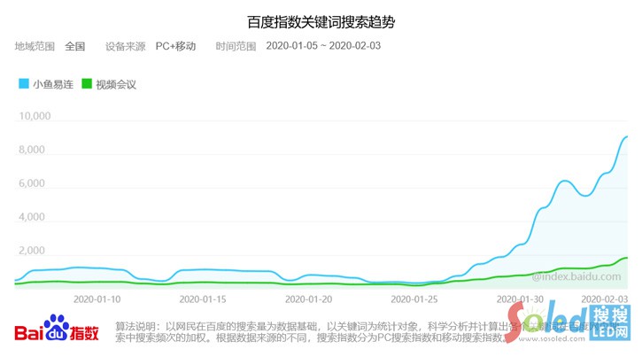 透過百度指數(shù)視頻會(huì)議相關(guān)的企業(yè)搜索指數(shù)暴增,以后起之秀小魚易連為例,日常平均搜索指數(shù)1000多,1月25日后直線暴增達(dá)9000多。