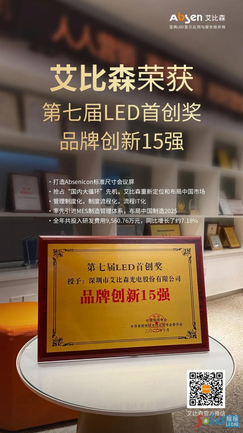 近日,艾比森捷報(bào)頻傳,再次斬獲五項(xiàng)行業(yè)頗具分量的大獎(jiǎng)。分別是中國(guó)光學(xué)光電子行業(yè)協(xié)會(huì)“2019-2020年度國(guó)內(nèi)LED知名品牌大獎(jiǎng)”和“2019-2020年度中國(guó)LED應(yīng)用工程優(yōu)秀獎(jiǎng)”、第七屆LED首創(chuàng)獎(jiǎng)“品牌創(chuàng)新15強(qiáng)”、2020華顯獎(jiǎng)“年度LED小間距知名品牌獎(jiǎng)”以及第十一屆數(shù)字標(biāo)牌行業(yè)金孔雀獎(jiǎng)“優(yōu)秀LED顯示屏品牌大獎(jiǎng)”。