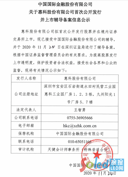 據(jù)披露,惠科股份有限公司擬首次公開發(fā)行股票并在境內(nèi)證券交易所上市,現(xiàn)已接受中國國際金融股份有限公司的輔導(dǎo),并于2020年11月24日在深圳證監(jiān)局進(jìn)行了輔導(dǎo)備案。