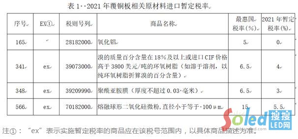2020年12月23日,國務(wù)院關(guān)稅稅則委員會以稅委會〔2020〕33號文,發(fā)布《關(guān)于2021年關(guān)稅調(diào)整方案的通知》。調(diào)整方案自2021年1月1日起實施。2021年與覆銅板相關(guān)的原材料維持2020年的暫定進(jìn)口優(yōu)惠稅率不變,具體見表1 (33號文附表1《進(jìn)口商品最惠國暫定稅率表》)。
