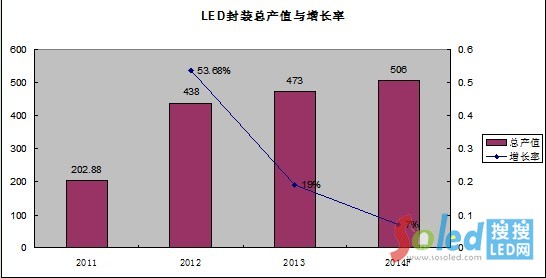 數(shù)據(jù)顯示,2012年國內(nèi)LED封裝總產(chǎn)值達(dá)到438億元,與2011年相比增長53.68%,其中廣東省產(chǎn)值達(dá)到323億元,增長57.56%,占國內(nèi)LED封裝總產(chǎn)值的73.74%。而2013年中國LED中游封裝473億元,同比增長19%。預(yù)計2014年將達(dá)到133.9億美金,年成長率為7%。
