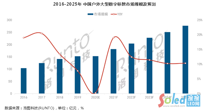 戶外大型數(shù)字標牌在我國起步較晚,尤其LED大屏的發(fā)展是伴隨2008年奧運會舉辦而活躍,隨后進入蓬勃發(fā)展期。受益于“夜經(jīng)濟”的興起和新基建政策的拉動,預計未來五年,戶外大型數(shù)字標牌市場的每年增長率保持在10%以上,2025年市場規(guī)模達270億元以上。