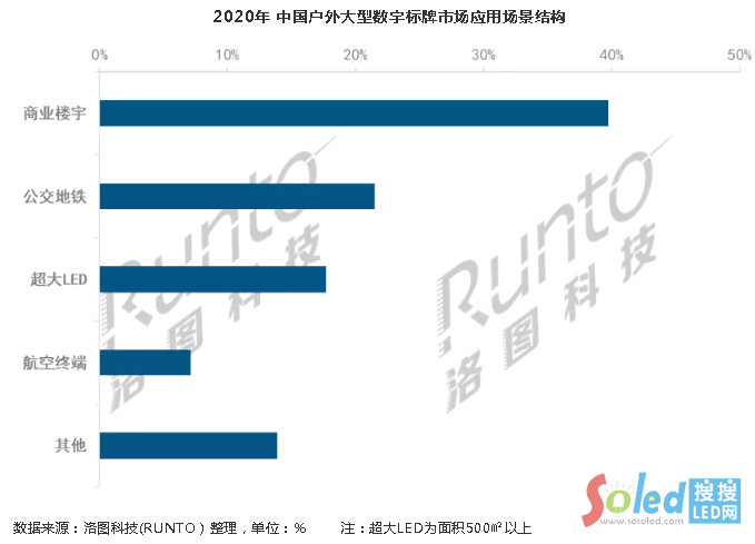 據(jù)洛圖科技(RUNTO)調研,戶外大型數(shù)字標牌主要應用在商業(yè)樓宇的信息發(fā)布上,比重接近40%。公交地鐵對戶外數(shù)字標牌的需求次之,占比超20%。