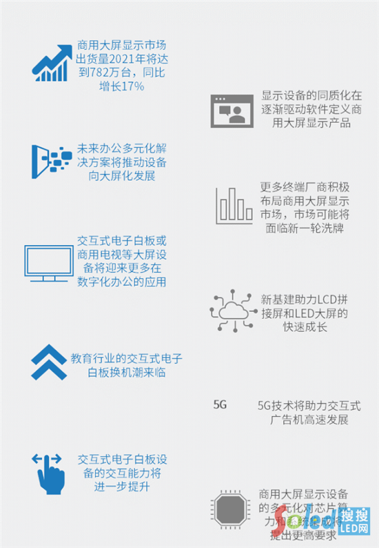隨著整體社會的數(shù)字化轉型進程加速,數(shù)字化轉型的推動和多項高新技術相互融合,數(shù)字屏幕已成為代替紙質(zhì)的主要媒介,小到手機、大到電視,抑或是商用大屏,在我們生活中都隨處可見。各大政務部門在推進智能化、數(shù)字化,這也推動了大屏的需求,而企業(yè)的會議、展廳、安防等方面對商用大屏的需求量也是非常大。目前,國家的多項新基建項目已經(jīng)啟動,這將在很大程度上進一步推進我國的經(jīng)濟發(fā)展和擴大商用大屏的出貨量。