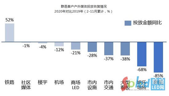 由于消費者的信賴度和需求產(chǎn)生的變化,更為貼近生活場景的戶外廣告以及剛需類戶外場景廣告因此具有更強的抗壓性。戶外廣告在下沉市場的優(yōu)勢和政策不斷推進的城鎮(zhèn)化發(fā)展讓其展現(xiàn)出了獨特魅力,加之疫情中后期,隨著消費者對國內(nèi)旅游需求上升,通過高鐵前往旅游城市及居住地周邊的出行方式在節(jié)假日受到消費者青睞,品牌的持續(xù)下沉需求和消費者集中覆蓋這兩大因素共同推動沿鐵路的投放恢復(fù)。此外,社區(qū)(家)、樓宇(工作地點)也出現(xiàn)較強的抗壓性,截至目前已經(jīng)基本恢復(fù)至去年同期水平。但由于2020年12月起至今,散發(fā)疫情逐漸嚴重,政府再次出臺限制政策,2021年春節(jié)以上戶外投放有可能會再受沖擊。