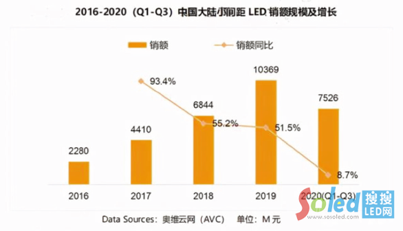 《2020中國商顯白皮書》指出,在全球疫情肆虐下,2020年前三季度,國內(nèi)小間距LED實(shí)現(xiàn)逆勢(shì)增長,安裝面積達(dá)到20.1萬平米,同比增長41%,銷售額達(dá)到75.26億元,同比增長8.7%。預(yù)估全年銷售額將在100億以上。