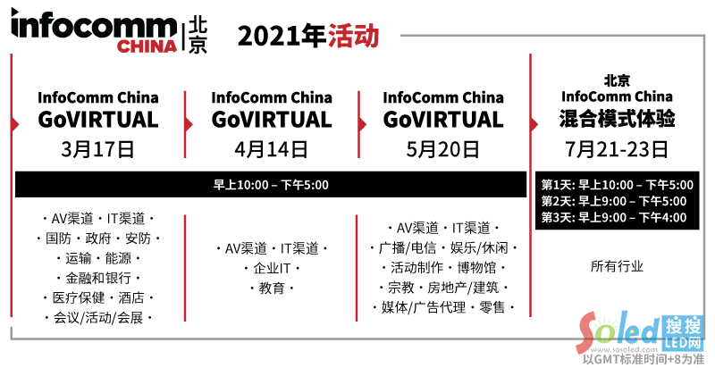 InfoComm China 2021呈獻(xiàn)全新模式,除了7月21-23日在北京的國家會(huì)議中心舉行線下展會(huì),在3-5月期間將舉辦三場(chǎng)GoVIRTUAL線上活動(dòng)。每場(chǎng)線上活動(dòng)將側(cè)重于特定行業(yè)舉辦研討會(huì)、產(chǎn)品演示等,為業(yè)界提供線上虛擬+線下體驗(yàn)混合模式的新體驗(yàn)。