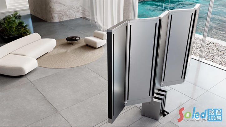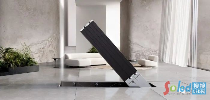 這款M1電視采用了全新的安裝和使用方法,在官方的演示視頻中,按下按鈕地板就會(huì)打開(kāi),之后電視先是呈柱狀從地面升起,5塊屏幕再自動(dòng)展開(kāi)成為一塊165英寸的電視大屏,帶來(lái)了全新的使用體驗(yàn)。