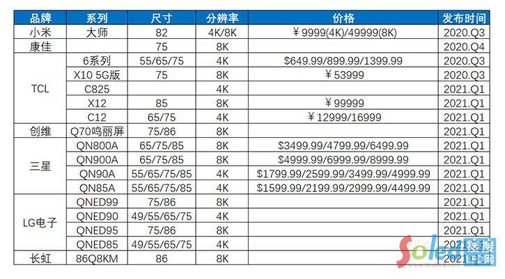從近期發(fā)布的新品可以看出,Mini LED背光電視產(chǎn)品線覆蓋已相當(dāng)廣泛,涵蓋49~86 8個(gè)尺寸,高中低端全線布局,2021年TCL C12、X12新品已在國(guó)內(nèi)開賣,三星的Neo QLED與LG電子的QNED系列新品也即將量產(chǎn)銷售。