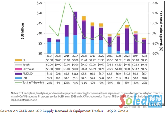 預(yù)計(jì)OLED面板市場(chǎng)的快速增長(zhǎng)將推動(dòng)OLED設(shè)備市場(chǎng)的增長(zhǎng)。Omdia預(yù)計(jì)2023年OLED設(shè)備市場(chǎng)將增長(zhǎng)至141億美元,其中OLED設(shè)備投資預(yù)計(jì)將達(dá)到106億美元。但總投資額將落后于中國(guó)大陸面板廠商在2017年至2018年間進(jìn)行的大規(guī)模LCD投資。