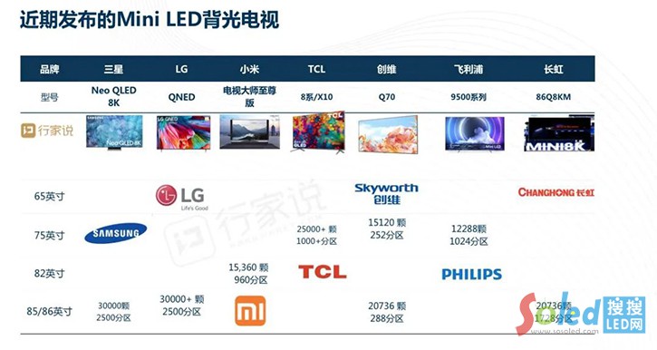 而從Mini LED背光應(yīng)用領(lǐng)域看,去年開(kāi)始,Mini LED資本熱度大增,全年新品密集發(fā)布,以芯片消耗拉動(dòng)最大的電視場(chǎng)景為例,三星、LG、小米、TCL、創(chuàng)維、飛利浦、長(zhǎng)虹、夏普八大電視品牌廠為例,均陸續(xù)高調(diào)推出了號(hào)稱Mini LED版電視。